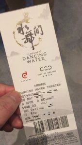 本日最後の予定は、『Dancing water』 ショーの鑑賞である。不思議な水の舞台とサーカスが融合したような内容であり、時間にして1.5時間程度公演された。建物の中にあの量の水と、ステージの仕掛けを作るあたりに日本にはないスケールの大きさを感じる。日本で考えると、ディズニーランドやUSJにしかないようなアトラクション施設がホテルの中にあるイメージだ。プールのように変形したり、舞台に変形したり、その中から高さ10メートル以上の構造物がせりあがってきたり、一瞬にして直前まであった水が掃ける構造等、このアトラクションを支える舞台のからくりは最後まで分からなかった。